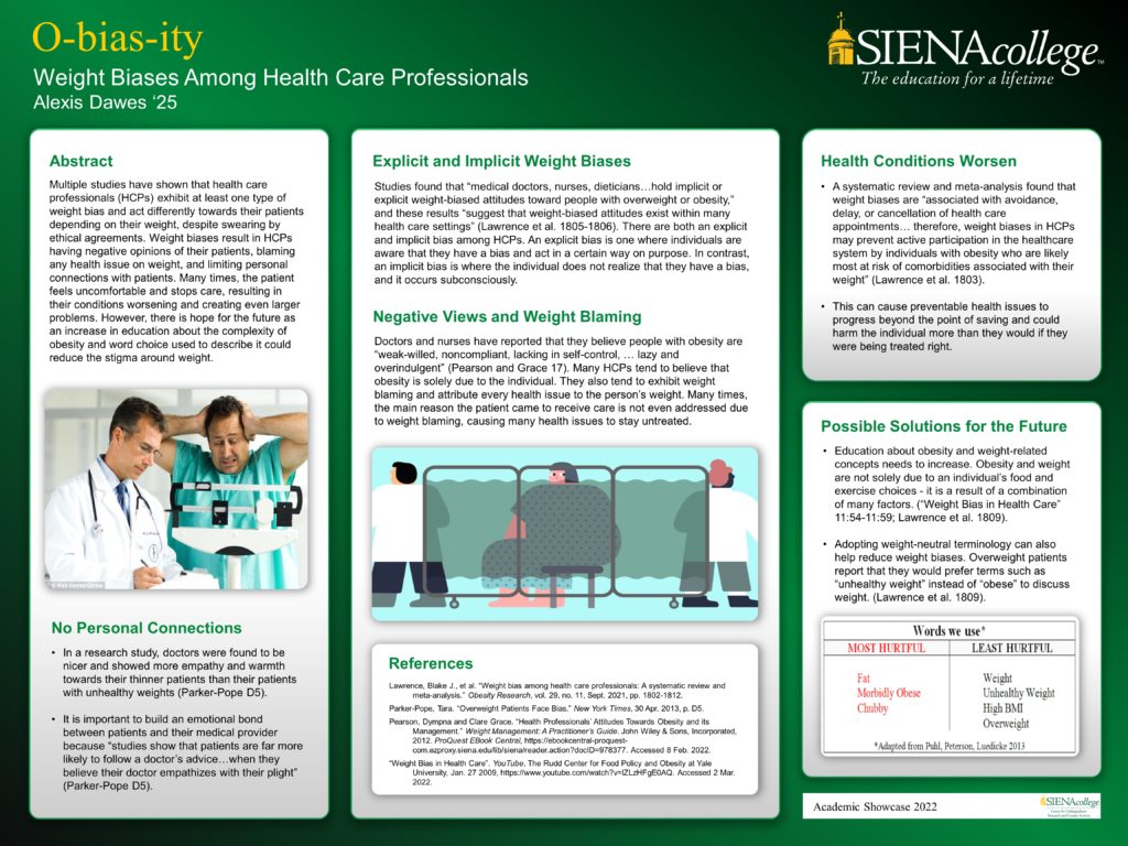 Abstract: Multiple studies have shown that health care professionals (HCPs) exhibit at least one type of weight bias and act differently towards their patients depending on their weight, despite swearing by ethical agreements. Weight biases result in HCPs having negative opinions of their patients, blaming any health issue on weight, and limiting personal connections with patients. Many times, the patient feels uncomfortable and stops care, resulting in their conditions worsening and creating even larger problems. However, there is hope for the future as an increase in education about the complexity of obesity and word choice used to describe it could reduce the stigma around weight.